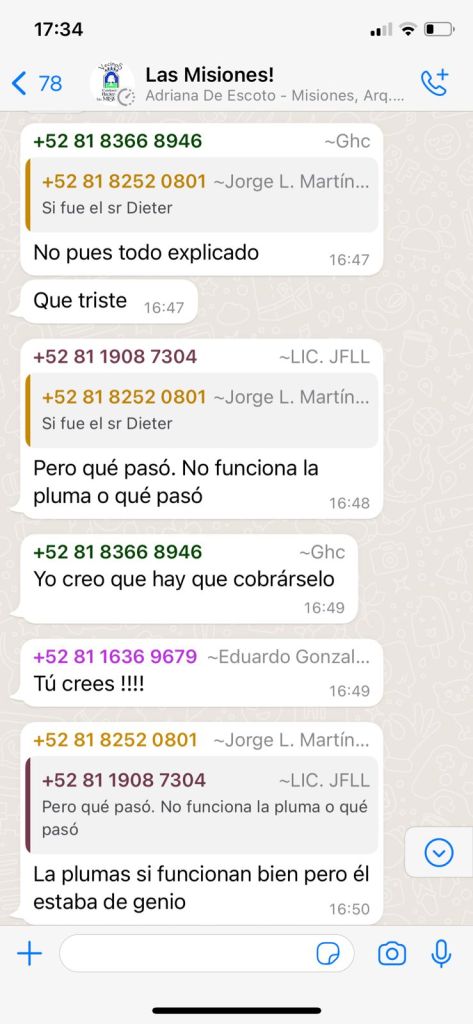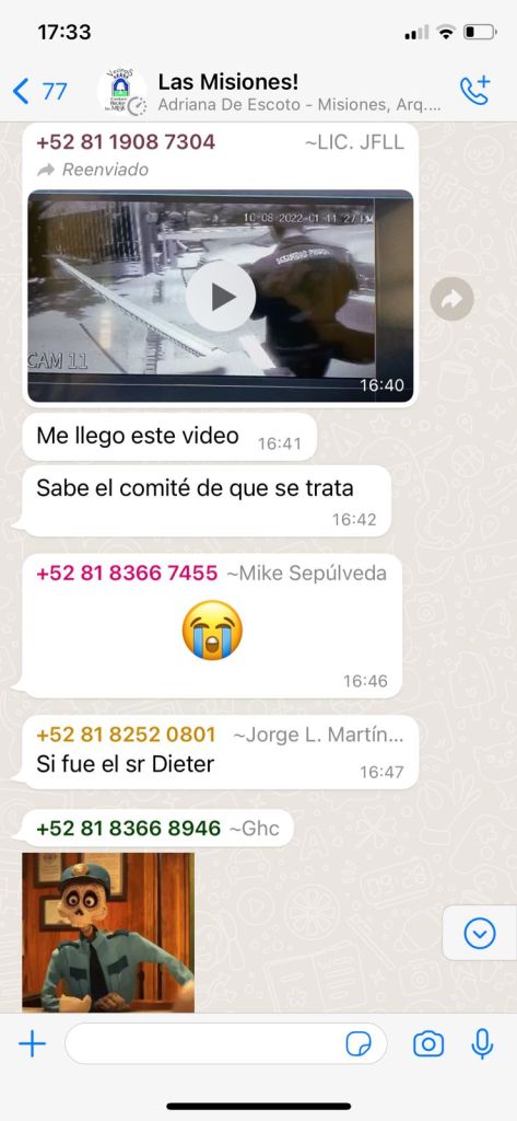 En el chat oficialista llamado «LAS MISIONES»; un vecino de nombre FRANCISCO LÓPEZ que pone hasta en el whatsapp LA PALABRA LIC., para buscar acreditar sus estudios, FILTRA un video de las cámaras del Condominio donde se ve la cara y los movimientos de uno de nuestros vecinos en la puerta de entrada, y se pregunta el «licenciado» en forma inocente, exhibiendo lo que natura le dio; «Sabe el comité de que se trata»…